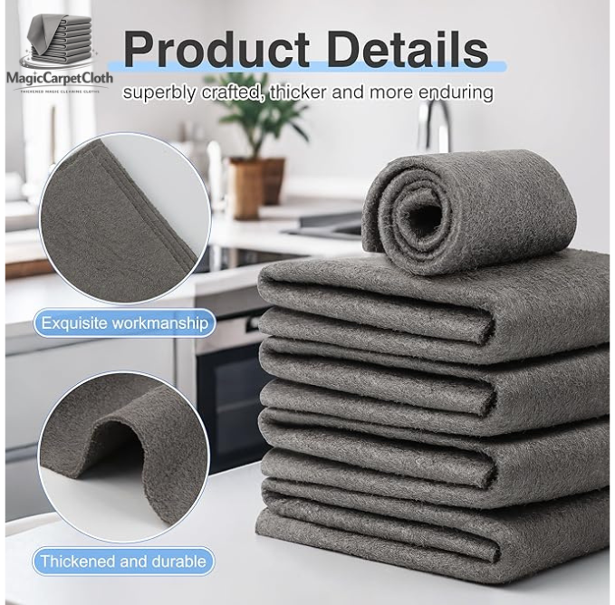 Each MagicCarpetCloth set includes 10 durable, reusable microfiber cloths. With proper care, they can be washed and reused hundreds of times, providing long-lasting cleaning performance for daily use—far outlasting disposable paper towels or ordinary cleaning cloths.